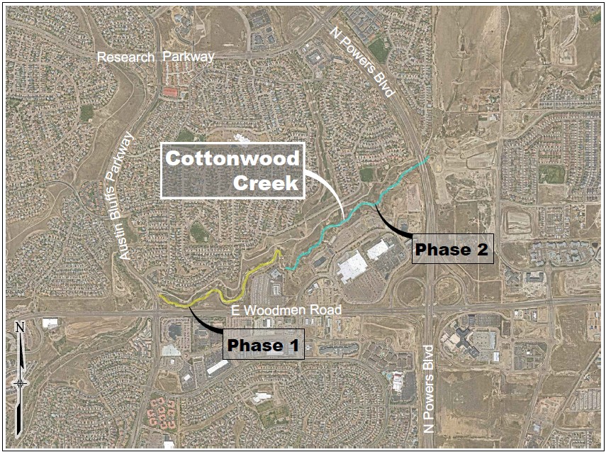 Cottonwood Creek is a major waterway through Colorado Springs. The creek collects rainwater from the northeast side of town and transports the water west to Monument Creek. Cottonwood Creek is a sandy creek system and has experienced increased erosion over the years as the area developed. The creek has eroded in some areas over 10 feet deep, and some areas are currently sunken below the adjacent natural floodplains that help reduce erosion. The continued erosion threatens bridges and other infrastructure.  The erosion also threatens critical utilities including gas, sewer, and electrical facilities along the creek. Erosion has led to a significant loss of vegetation and natural habitat along the corridor.