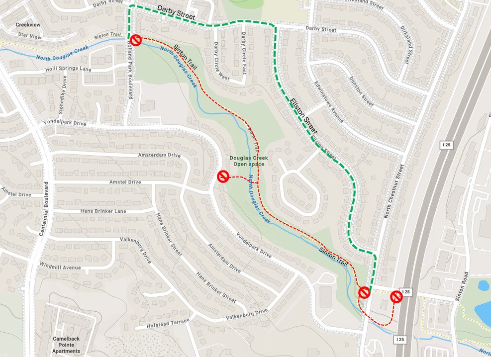 Sinton Trail between Holland Park Blvd. and North Chestnut Street is now closed for construction. Please see the map below for detour information.