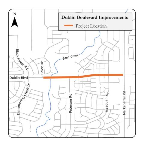 Dublin Boulevard from Fieler Drive to Marksheffel Road will be improved. It will change from a two-lane road to a four-lane road with shoulders. A raised median will be constructed to match other sections of Dublin Boulevard. Other improvements include a 10-foot multi-use path along both sides of the street, trail connections along Sand Creek, and a new traffic signal at Issaquah Drive. Drainage upgrades include storm sewer pipes, inlets and water quality structures. This project will add a new traffic signal at Issaquah Drive. It will address recurring groundwater collecting west of Peterson Road.