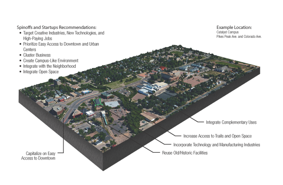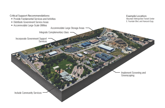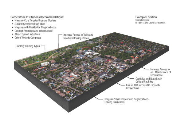 Core educational, medical, aviation, and military institutions of Colorado Springs have long served as the foundation of the local economy. The economic success of the city is in large part driven by these institutions. They attract and create new talent, generate emerging spinoff industries, and enhance overall quality of life in Colorado Springs. While these institutions are located throughout the city, they are most often concentrated on major campuses that function as nodes of activity and employment. Ensuring these institutions remain strengths for Colorado Springs while also integrating into surrounding neighborhoods is a focus of this Plan. This can be accomplished through continued investment in quality infrastructure, integrating these campuses within surrounding neighborhoods, and collaborative approaches to meet workforce needs such as nearby attainably-priced housing. Places that accommodate this industry typology include Downtown, other urban activity centers, and existing and new campus-style developments.