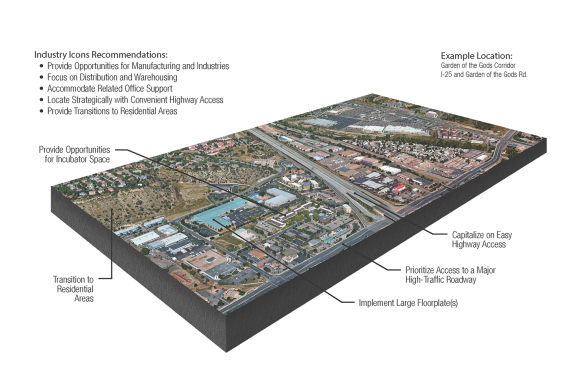Places that can accommodate this economic typology are those along interstate and highway corridors that are properly buffered from residential areas. These areas require truck, heavy equipment, and sometimes rail access. Some industries in this typology are a fit in locations that would be suitable for the Industry Icons typology. Others have a combination of requirements and impacts that support their segregation from most other uses in the city. Strategies to support this typology focus on maintaining quality basic infrastructure, identifying and retaining sites and locations for higher impact industrial-type uses, reducing impact on nearby residential areas, providing affordable workforce housing, and fiscally responsible city management to ensure that Colorado Springs’ city services remain reliable.